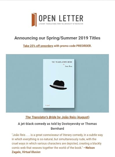 Subscrevam o catálogo da Open Letter por um ano e, além de adquirirem uma série de fantásticos livros (que incluem a versão em Inglês de «A Noiva do Tradutor»), obterão uma T-shirt gratuita.