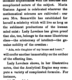 (Lovelace wrote the notes anonymously, of course, but was outed by the Statistical Society in 1848, “with the permission of Lord Lovelace”).