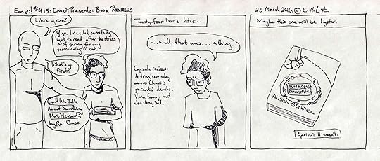 I haven’t been dealing with the stress super well. Currently I’m running around 45 miles per week, and at this rate I might hit 200 miles for the month of March (I’ve got 180 so far). I have a lot to do, but it’s hard to focus on. In addition, I’m trying to finish up a play which is really stressing me out as well (the subject matter is a bit dark). If anyone has any suggestions for light reading, I’d be excited to hear them. After my adventures with Chast and Bechdel, I’m down to reading Good Omens for the fifteenth time. Anything funny / romantic / escapist would do.
