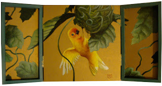 citrinitas , yellowing: spiritualization, enlightenment; the sun, male. The goldfinch lives among thorns and hardship, but it's yellow gold light indicates it's proximity to divine Light. The background here is painted with gold.