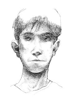 nigredo , blackening (putrefaction): corruption, dissolution. I mixed the paint with ash in this image to represent the burnt-out nature of the beginning of this process. Starting out with nothing, but with the beginnings of a trail (the red string) we can follow all the way to perfection.