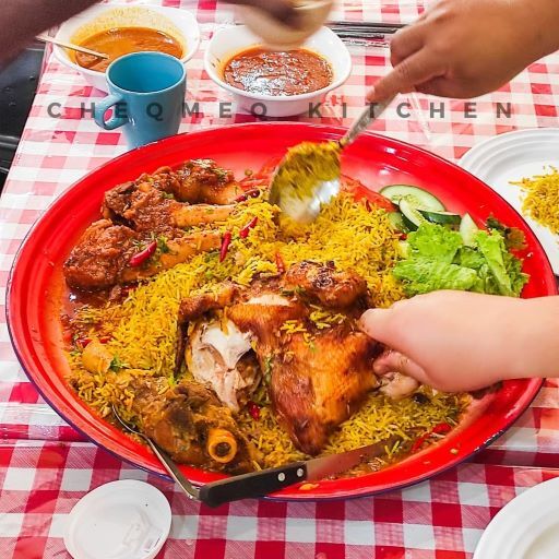 Menu makanan di CheqMeq Kitachen tidak hanya terhad untuk makanan melayu sahaja. Malahan, terdapat juga makanan Arab. Jika anda penggemar nasi arab dan datang bersama keluarga yang ramai, apa kata anda mencuba Nasi Arab Set Talam mereka yang cukup besar untuk enam orang ini?
