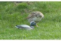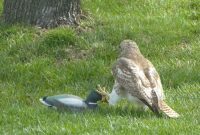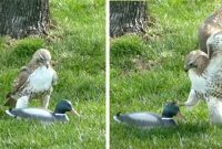 Selepas perasan tiada tindak balas dari hujung yang lain, helang itu mengelilingi itik itu, meletakkan cakarnya di seluruh badannya seolah-olah cuba membangunkan itik itu dari lena. Akhirnya, semua percubaannya gagal, dan burung pemangsa itu menyerah dan melarikan diri untuk mencari musuh yang lebih layak. Helang ini tidak akan lupa hari dia dikalahkan oleh itik tiruan.