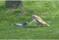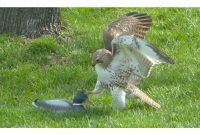 Untuk seketika, helang yang keliru cuba menakutkan dan mengalahkan itik yang kelihatan luar biasa ini. Helang itu mungkin dilihat merenung dari semasa ke semasa seolah-olah memeriksa untuk memastikan dia tidak tertipu oleh seseorang. Pada mulanya, helang itu bergerak pantas ke arah itik, cuba merampasnya dengan kukunya.