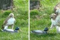 Namun, helang itu tidak menyedari bahawa itik ini hanyalah umpan dan patung palsu. Inilah sebab mengapa itik tidak gentar dengan kehadiran burung berbahaya ini. Nasib baik untuk anda, kami mempunyai bukti video tentang keseluruhan pertemuan, yang pastinya menghiburkan
