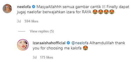 Neelofa yang baru habis berpantang selepas melahirkan anak lelaki pertamanya turut hadir diruangan komen posting berkenaan dengan memberikan komen tentang kegembiraanya menggunakan wajah Izara sebagai duta produknya itu.