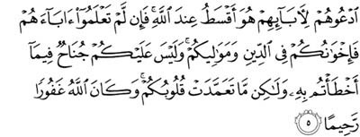 (maksudnya): Panggilah mereka itu (dengan ber”bin”kan) kepada bapa-bapa mereka sendiri; cara itulah yang lebih adil di sisi Allah. Jika kamu tidak mengetahui bapa-bapa mereka, maka panggilah mereka sebagai saudara-saudara kamu seagama dan sebagai “maula-maula” kamu. Kamu pula tidak dikira berdosa dalam perkara yang kamu tersilap melakukannya, tetapi (yang dikira berdosa itu ialah perbuatan) yang disengajakan oleh hati kamu. Dan (ingatlah) Allah Maha Pengampun, lagi Maha Mengasihani. (Surah al-Ahzab: 5).