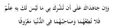 (maksudnya) “Dan jika kedua ibubapa mendesakmu supaya engkau mensyirikkan denganku sesuatu yang engkau (dengan fikiran warasmu) tidak mengetahui sungguh adanya maka janganlah engkau taat kepada kedua; dan bergaulah dengan mereka di dunia dengan cara yang baik…”.