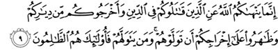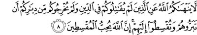 (maksudnya): “Allah tidak melarang kamu daripada berbuat baik dan memeberikan sumbangan harta kepada orang-orang yang tidak memerangi kamu kerana ugama (kamu), dan tidak mengeluarkan kamu dari kampung halaman kamu; Sesungguhnya Allah mengasihi orang-orang Yang berlaku adil.9. Sesungguhnya Allah hanyalah melarang kamu daripada menjadikan teman rapat orang-orang yang memerangi kamu kerana ugama (kamu), dan mengeluarkan kamu dari kampung halaman kamu, serta membantu (orang lain) untuk mengusir kamu. dan (ingatlah), sesiapa yang menjadikan mereka teman rapat, maka mereka itulah orang-orang yang zalim”.
