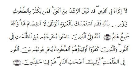 (maksudnya): “Tidak ada paksaan dalam agama (Islam), kerana sesungguhnya telah nyata kebenaran (Islam) dari kesesatan (kufur). oleh itu, sesiapa yang tidak percayakan taghut, dan beriman kepada Allah, maka sesungguhnya ia telah berpegang kepada simpulan (tali ugama) yang teguh yang tidak akan putus. Dan (ingatlah), Allah Maha Mendengar, lagi Maha mengetahui. Allah Pelindung (yang mengawal dan menolong) orang-orang yang beriman. Dia mengeluarkan mereka dari kegelapan-kegelapan kepada cahaya (iman). dan orang-orang yang engkar, penolong-penolong mereka ialah taghut yang mengeluarkan mereka dari cahaya (iman) kepada kegelapan-kegelapan. Mereka itulah ahli neraka, mereka kekal di dalamnya”.