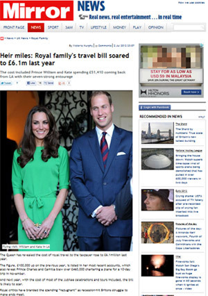 “July 2011 Prince William and Kate spent £54,410 returning from LA with their staff of seven after touring Canada and California. A source said they paid business class fares for first class flights”.
