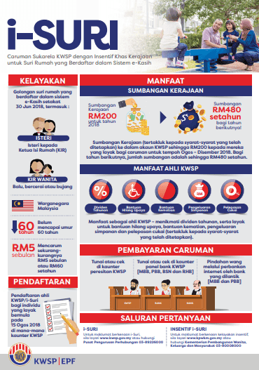 Bayaran RM480 diberikan bermula dari 2019 sehingga tahun-tahun berikutnya termasuk 2021.Bantuan kematian turut disediakan berjumlah RM2,500.Penerima i-Suri akan menerima dividen tahunan KWSP seperti pencarum lain.Bantuan orang kurang upaya.Pengeluaran simpanan.Insentif kerajaan.SYARAT KELAYAKANBerikut adalah merupakan beberapa syarat telah ditetapkan kepada yang berminat untuk membuat pendaftaran i-Suri: