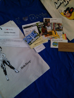 "I <3 Books" t-shirts, bookmarks, business cards, candy, and novelty canvas totes with vintage comics characters given to Tic Tac Trope winners and participants.