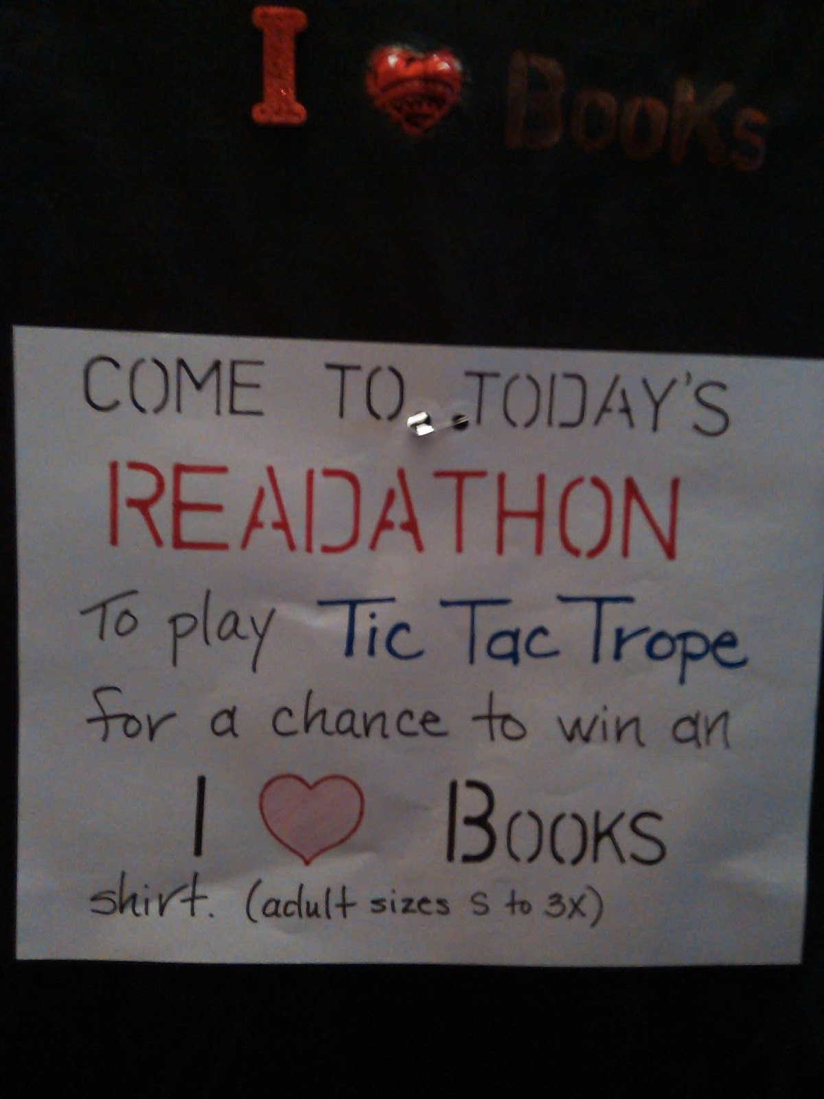 Thank you to the librarian who coordinated the Readathon, all of the talented participants, and the supportive attendees who were such enthusiastic listeners and gracious beta testers as players of Tic Tac Trope. Everyone contributed to making it a fun event.
