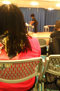 Well, snapping pics never seems to make it onto my mental to-do list until AFTER an event has ended. (A chronic oversight that’s likely Freudian in nature.) Blame my camera averse inner hermit, who also didn’t want to video record my segment. But my parents* (the same people who frequently call me about “fixing” the solid blue screen on their television) did. The blurry photo of me standing in profile leaning forward with my shirt baggy at the waist (SO flattering!) is their contribution as my self-appointed film crew. (It was a very good natural hair day though.)