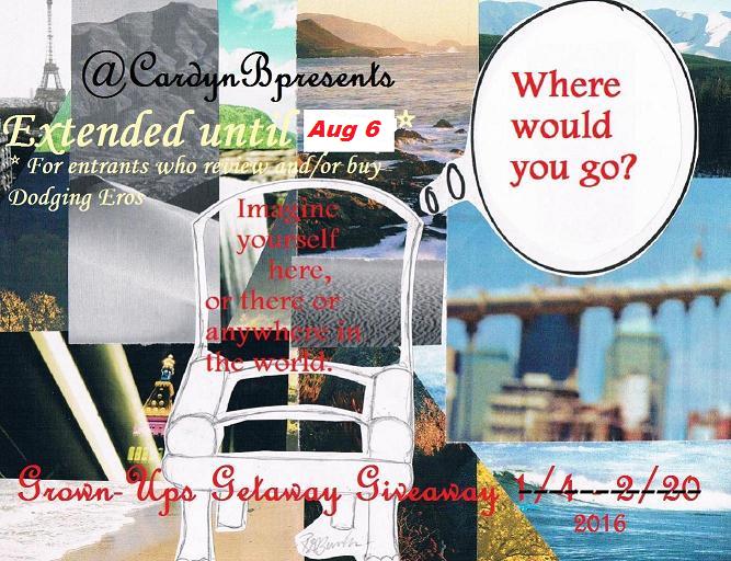 After many delays of the Murphy’s Law variety, the print edition of Dodging Eros, Through Past, Present and Pleasure is scheduled to be available for the summer reading season, which is why the Grown-Ups Getaway Giveaway has been extended to Saturday, August 6, 2016 with the second winner’s name posted by Saturday, August 13.