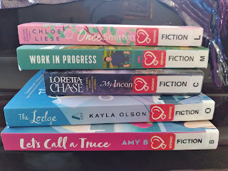 [a book stack of 5 paperbacks from top to bottom: Once Smitten Twice Shy, Work in Progress, My Inconvenient Duke, The Lodge, Let's Call a Truce]