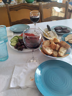 [a dining table covered in a white linen cloth; 2 linen napkins, 2 salad plates, 2 filled water glasses, 2 glass goblets half-full of red wine, charcuterie plates of fruit, meat, bread, crackers, brownies]