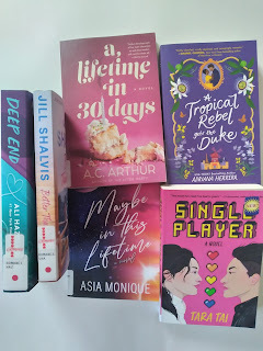 [6 trade paperback library books from left to right: 2 arranged spine up - Deep End, Better Than Friends; 4 arranged face up - A Lifetime in 30 Days, A Tropical Rebel Gets the Duke, Maybe in This Lifetime, Single Player]