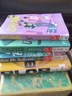 [a bookstack of 4 titles from top to bottom: Spiral, Unloved, Give Me Butterflies, Blob]