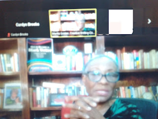 [a blurry screenshot of author Marita Golden seated in front of shelves filled with books; How to Become a Black Writer is facing forward on the shelf visible over her right shoulder]