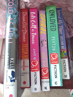 [6 books arranged with their spines up from left to right: Cold As Hell, Dream Girl Drama, Let's Call a Truce, Spiral, Unloved, Wreck My Plans]