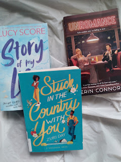 [3 trade paperback romance books arranged face up from left to right: Story of My Life, Stuck in the Country with You, Unromance]