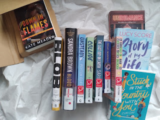 [11 books from left to right: face up against an open cardboard mailing box - Down in Flames; binding edge up - Blob, Blood Moon, Unsteady, Collide, The Last Guy on Earth, The Devil's Charm, A Five Letter Word for Love; 3 more face up - Unromance, Story of My Life, Stuck in the Country with You]