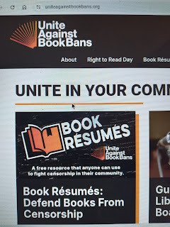 [screen shot from the Unite Against Book Bans website homepage with their open book logo in the upper left corner and "Unite in Your Community" links to resources to defend books from censorship]