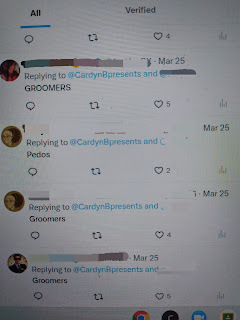 [a chain of comments from 3 different formerly-twitter accounts in response to an October 2024 post with a photo of a "We Are a Book Sanctuary" display at a local library: 3/25/25 "Groomers" from 3 different accounts; 3/25/25 "Pedos" from 1 account]
