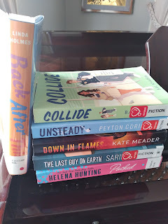[6 books arranged from left to right atop a piano: binding side - Back After This; horizontal stack from top to bottom - Collide, Unsteady, Down in Flames, The Last Guy on Earth, Pucked]