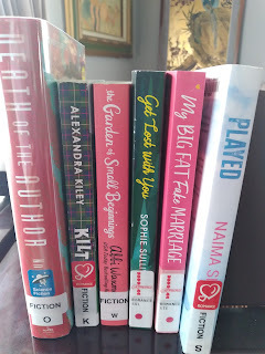 [6 books arranged vertically from left to right: Death of the Author, Kilt Trip, The Garden of Small Beginnings, Get Lost with You, My Big Fat Fake Marriage, Played]