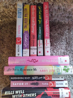 [a vertical row of trade paperback books from left to right: Played, Pucked Up, The Garden of Small Beginnings, Get Lost with You, My Big Fat Fake Marriage - on top of a vertical stack of TBR books from top to bottom: Flirting Lessons, Say You'll Remember Me, Scot and Bothered, Savor It, Kills Well with Others]