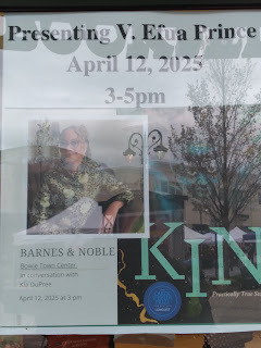 [a poster in the front window of a bookstore: "Presenting V. Efua Prince, April 12, 2025, 3-5pm" for Kin: Practically True Stories]