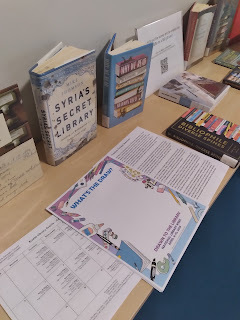 [a long rectangular table with several library books about libraries; a calendar of library events in April; a "What's the Draw?" worksheet, and a QR code for a questionnaire]