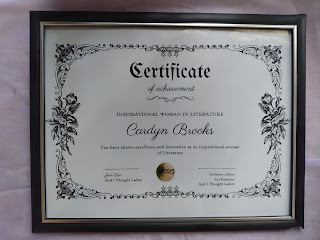 [a framed 8in x 11in "Certificate of achievement, Inspirational Woman of Literature, Cardyn Brooks, You have shown excellence and innovation as an inspirational woman of Literature 2025, Jade Dee, Wilnona Marie, And I thought Ladies"]