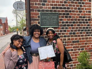 [three women standing in front of the corner of a brick building with a "Reynolds Tavern..." plaque above their heads; a "1747 Pub" sign hangs higher and farther behind them]