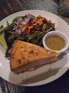 [a dinner plate filled with one slice of quiche Lorraine, a tossed garden salad and a small dish of salad dressing]