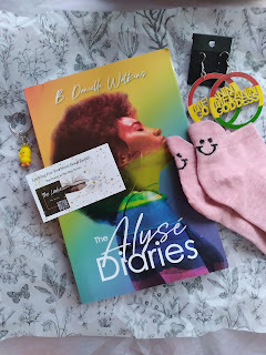 [a small chick keychain, an And I Thought Ladies business card, a trade paperback copy of The Alyse Diaries by B. Danielle Watkins, a pair of "Melanin Goddess" earrings, a pair of pink footie socks with smiley faces on the heel]