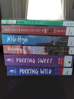 [a bookstack of 6 books from top to bottom: Mister Hockey, Head Coach & Virgin Territory, Mile High, The Right Move, Pucking Sweet, Pucking Wild]