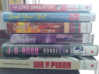 [a bookstack of 6 books from top to bottom: The Love Simulation, Shoot Your Shot, Caught Up, Play Along, Bonded in Death, We The Pizza]
