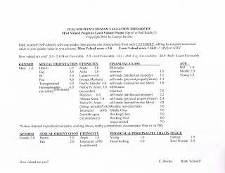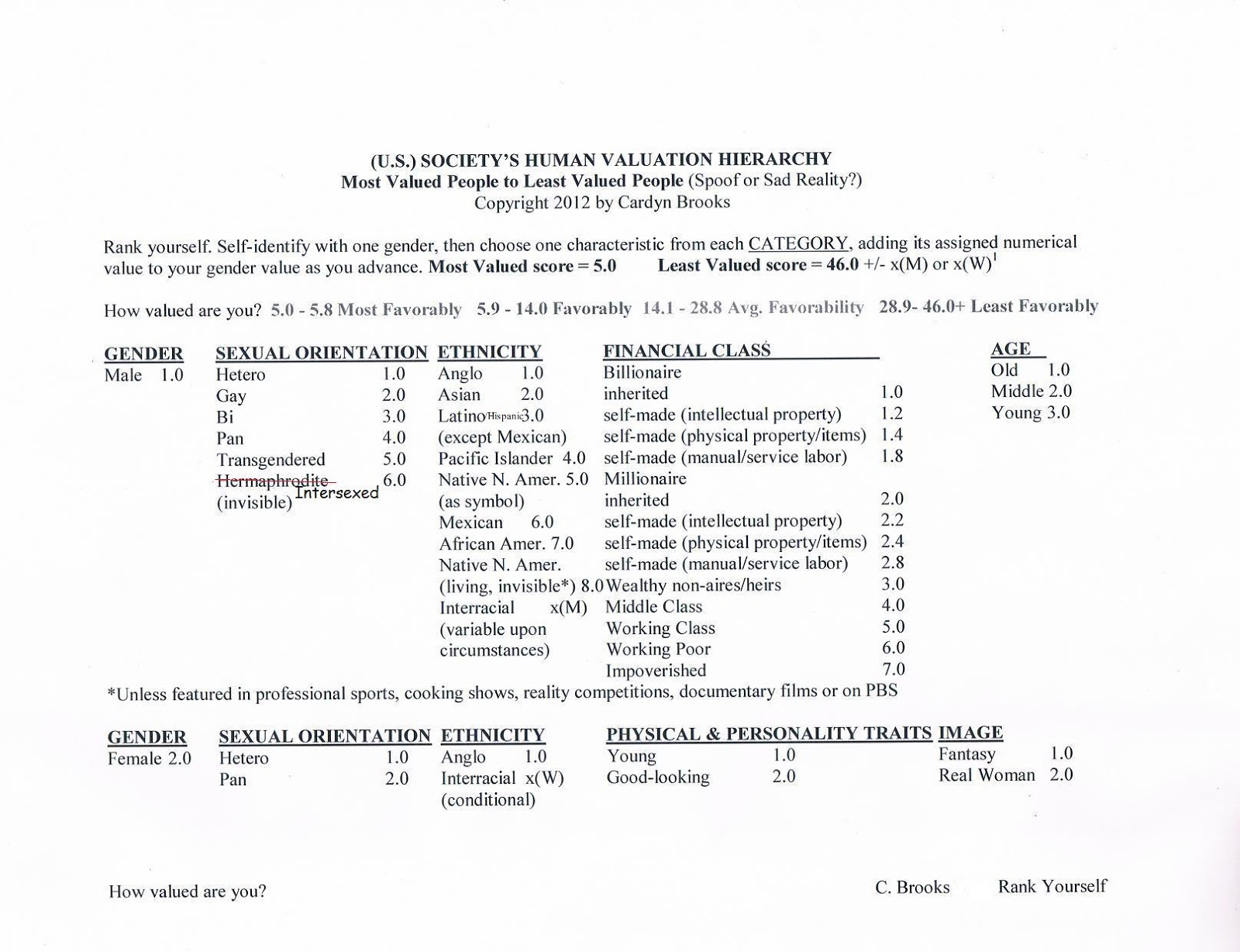 My personal belief is that every person is of equal intrinsic value to the enrichment of civilization regardless of gender, skin color, ethnicity, sexual orientation, age, social class or religion. Unfortunately, present-day society uses a more convoluted formula to assign value to people.