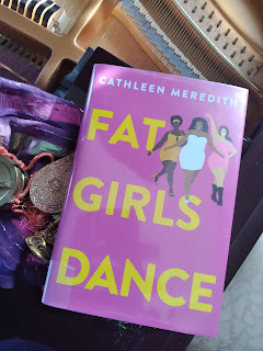 [front hardcover of Fat Girls Dance by Cathleen Meredith showing 3 curvaceous women striking poses; book is arranged atop an open piano with cords displayed]