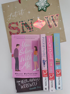["Let it snow" gift bag arranged under 5 trade paperback books: You Belong With Me, How to Help a Hungry Werewolf, Puck & Prejudice, Like Cats & Dogs, The Finders Keepers Library]