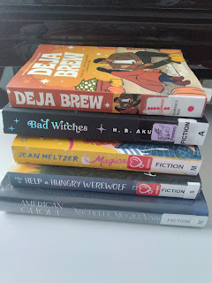 [a bookstack of 5 titles from top to bottom: Deja Brew, Bad Witches, Magical Meet Cute, How to Help a Hungry Werewolf, American Ghoul]