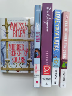 [5 books, from left to right: front hardcover up of Murder in Berkeley Square; paperback spines up of Love Delayed, The Wingman, Love You a Latke, I'll Be Gone for Christmas] Murder in Berkeley Square (Lady Worthing #3) by Vanessa Riley historical mystery Kensington Books, September 2024