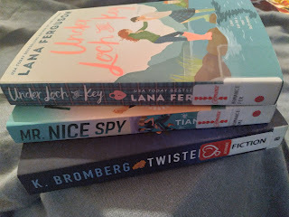 [bookstack of 3 paperbacks: Under Loch and Key, Mr. Nice Spy, Twisted Knight]