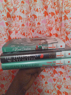 [3 books being held on the edge of a person's hand, from top to bottom: A Novel Christmas by Charity Shane', The House at Watch Hill by Karen Marie Moning, One Big Happy Family by Susan Mallery; all 3 against a "love" & hearts patterned background]