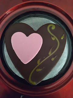 [a small heart-shaped chocolate cake decorated with a curving vine next to a smaller pink heart]