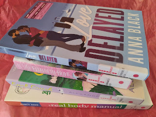 [a book stack of 4 books from top to bottom: Love Delayed, No Ordinary Duchess, Earl Crush, The Real Body Manual: Your Visual Guide to Health & Wellness]